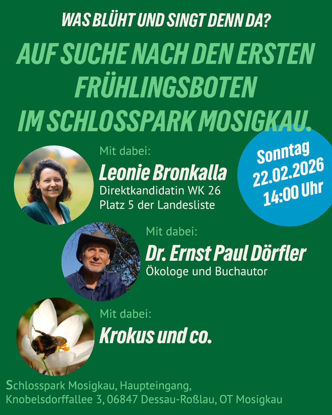 Mit Direktkandidatin Leonie Bronkalla (GRÜNE) und dem prominenten Experten Dr. Ernst Paul Dörfler auf der Suche nach den ersten Frühlingsboten im Schlosspark Mosigkau.